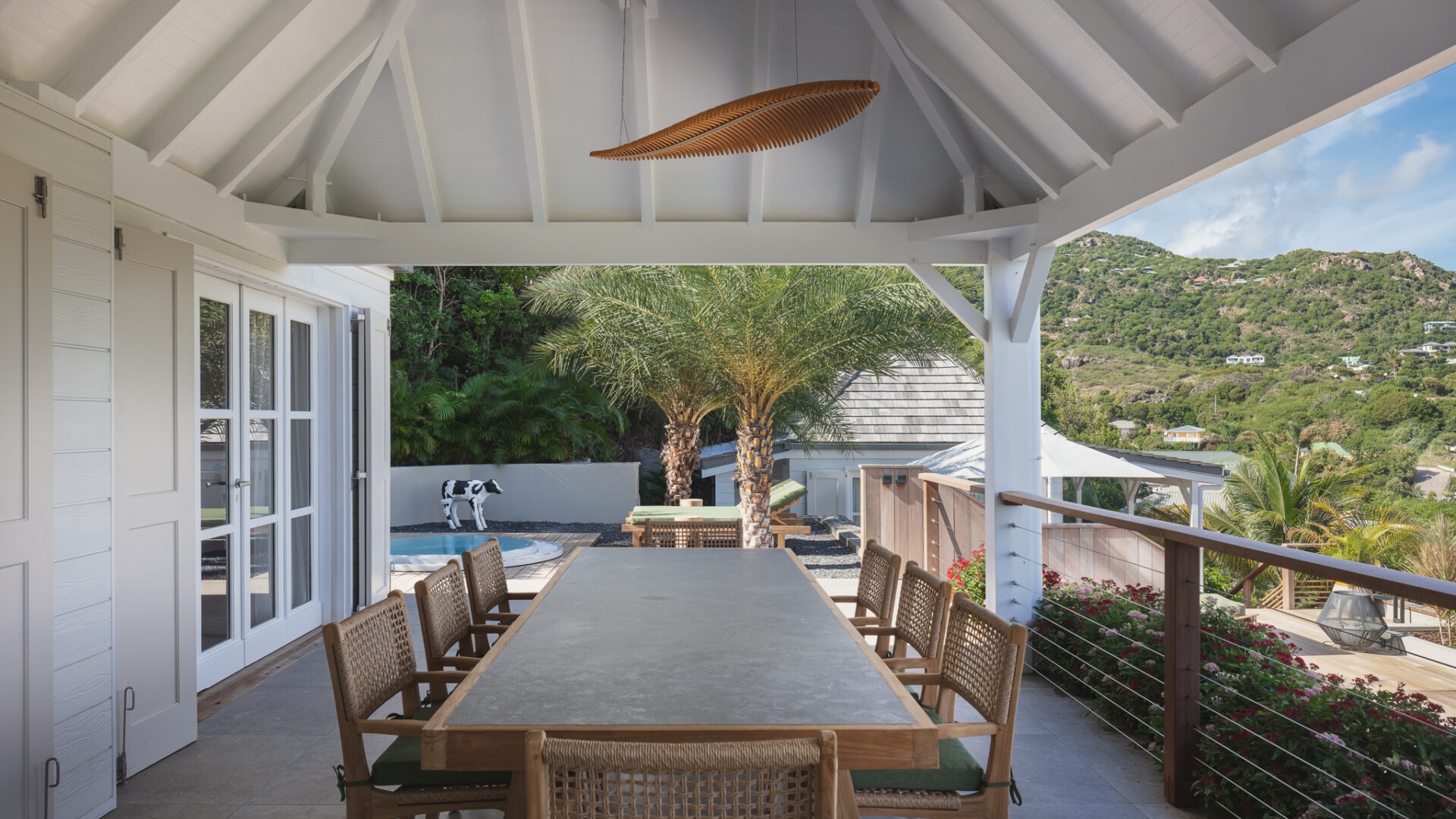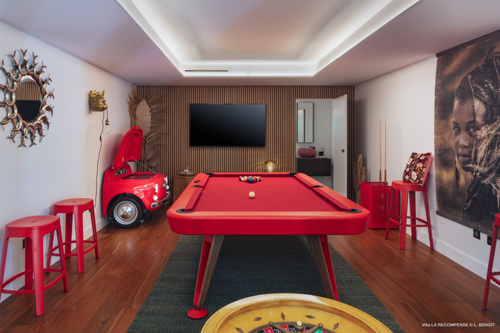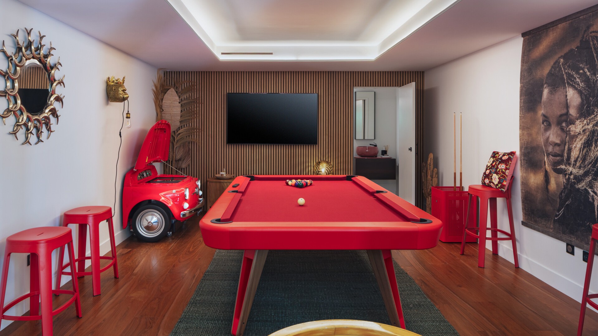 A dedicated entertainment area with a pool table and ping pong table brings a playful dimension to the villa, ideal after a day discovering the wild coves of the island, enjoying waterside dining in Grand-Cul-de-Sac, or exploring the scenic paths around the Vitet hills.