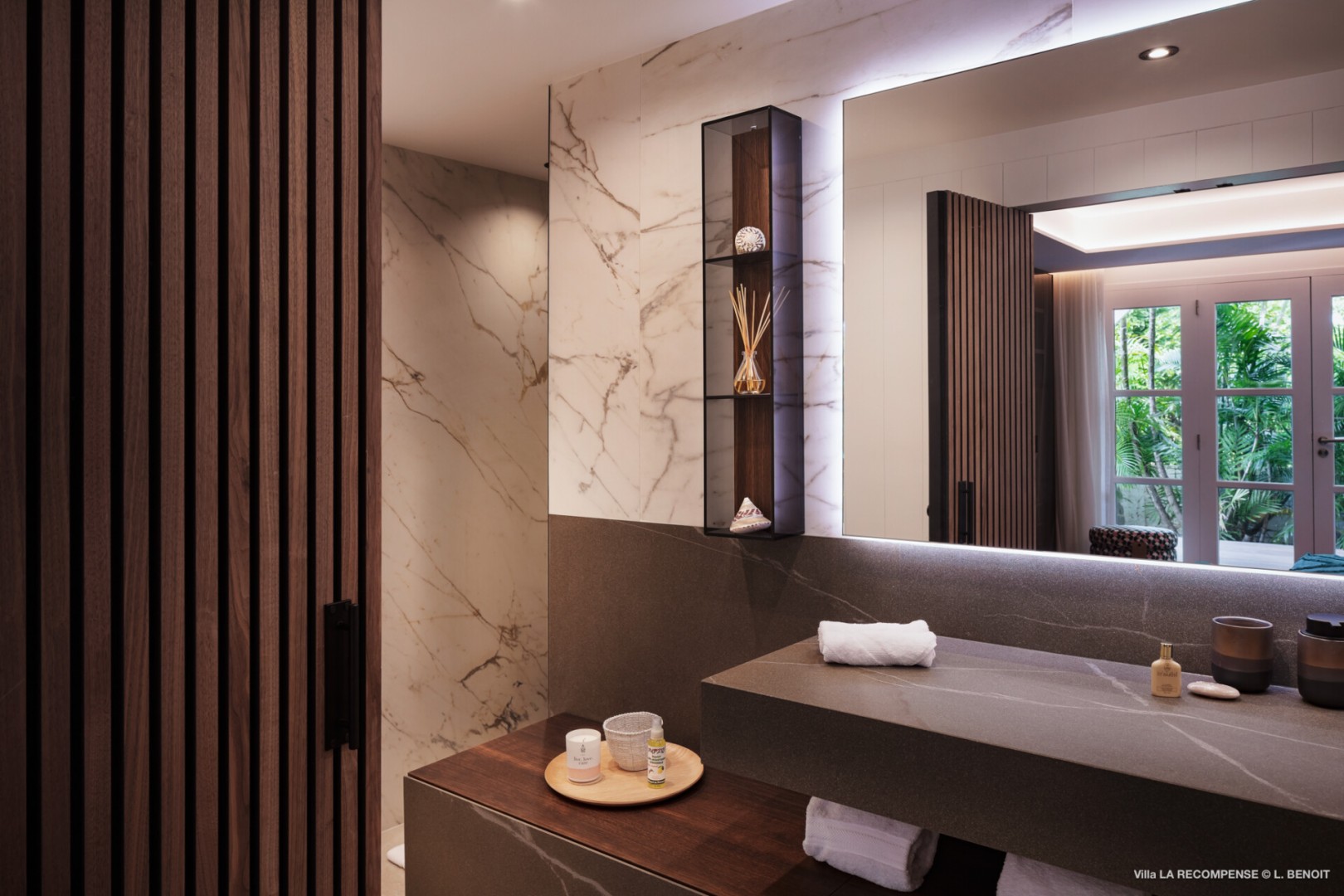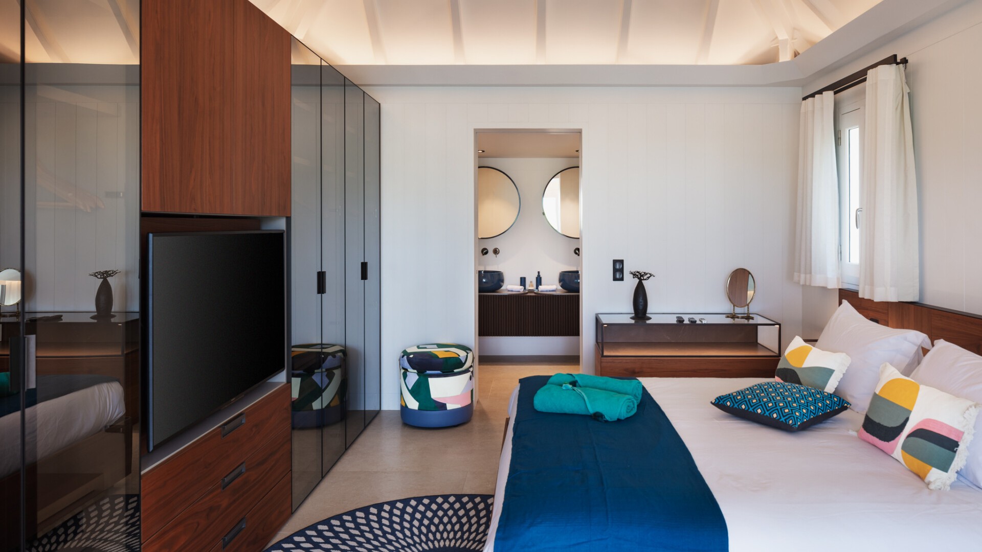 Each of the three bedrooms features its own en-suite bathroom, conceived as serene suites with natural tones, fine linens, and direct outdoor access, ensuring both intimacy and ease throughout the stay.