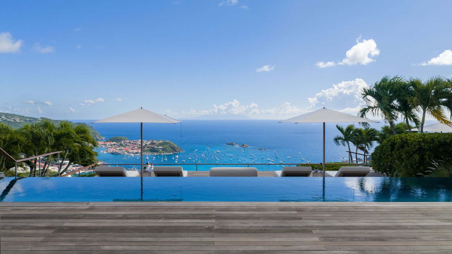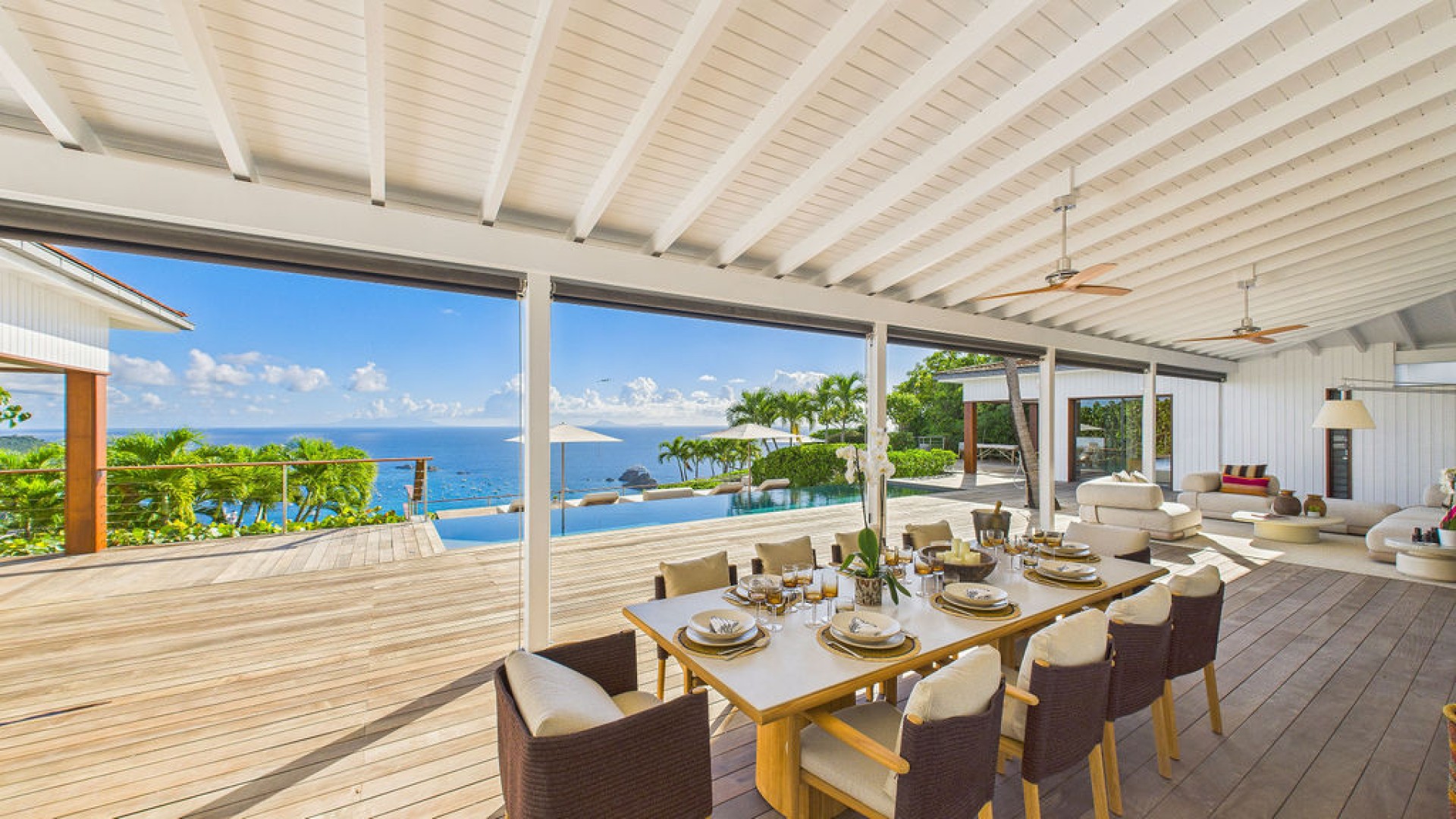 Les espaces extérieurs invitent à profiter pleinement de la douceur de l’île. Un salon couvert et une salle à manger abritée permettent de vivre dehors à tout moment de la journée, tandis que la grande terrasse de 300 m² entoure une superbe piscine à débordement offrant une vue ininterrompue sur la mer et les îlets environnants. L’ensemble est sublimé par un jardin tropical soigneusement entretenu, créant une ambiance intime et apaisante.