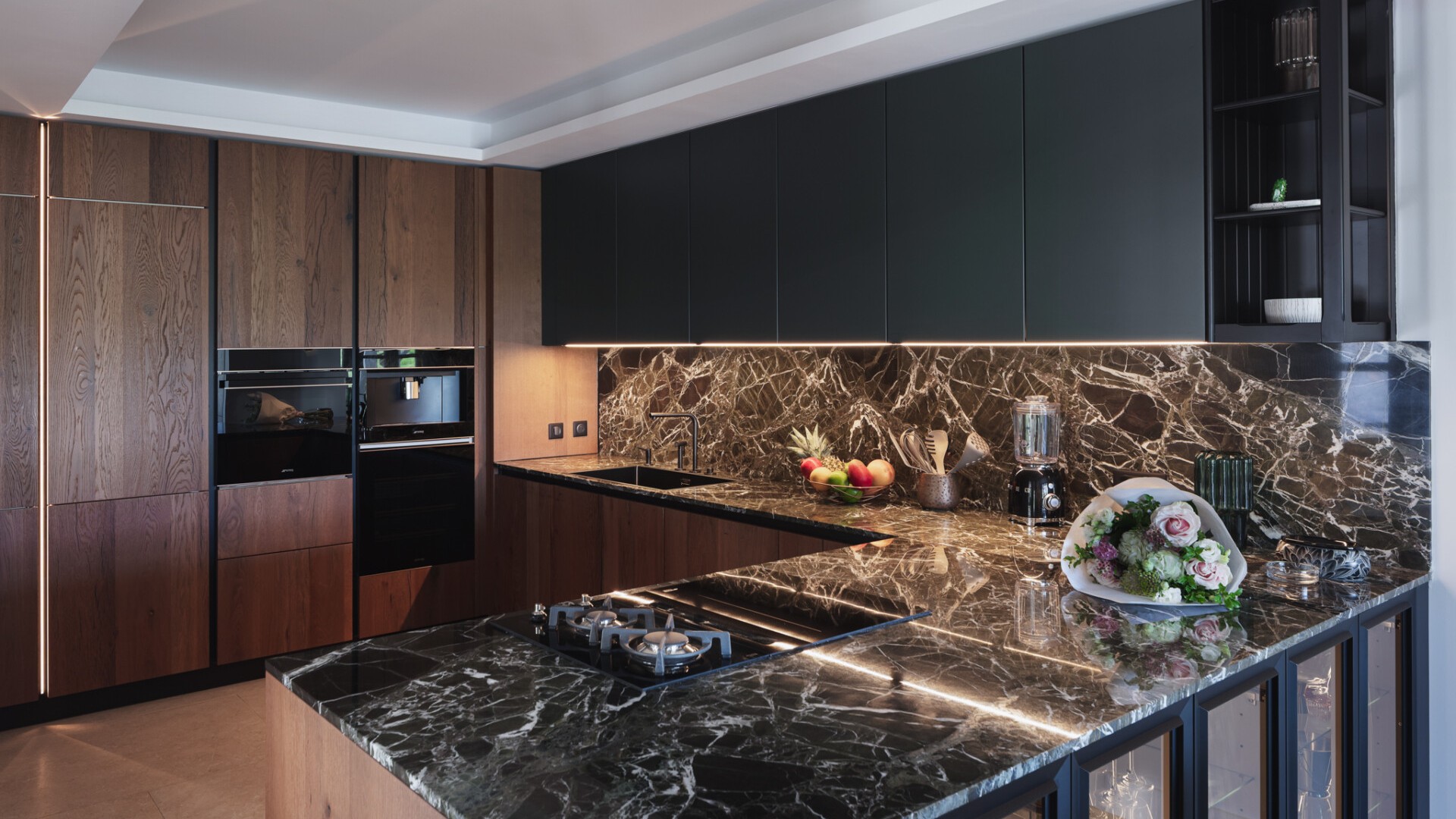 The main living area opens entirely onto the terrace, creating a fluid connection between indoor softness and the vivid colors of the bay. Outdoors, a heated pool stretches toward the horizon, while a soothing jacuzzi provides the perfect vantage point for sunset moments.