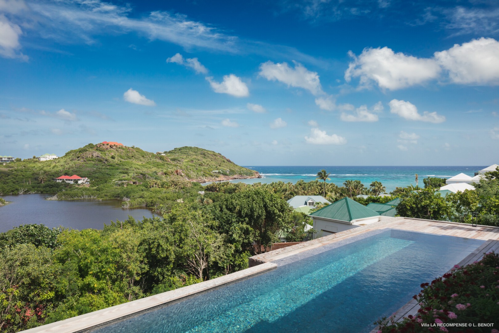 Set in Petit Cul-de-Sac, La Récompense overlooks the tranquil lagoon, offering a calm and luminous setting where sea and sky merge seamlessly. Designed for up to six guests, this contemporary retreat combines comfort, privacy, and understated elegance, ideal for those seeking refined Sun Beach House.